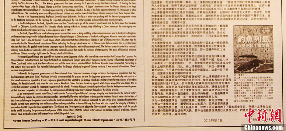 中国企业家陈光标之子陈环境在8月5日的美国《纽约时报》刊登广告,宣示钓鱼岛主权。他引述日本著名学者井上清的著作表示,钓鱼岛自古以来就是中国领土。陈光标在去年8月《纽约时报》上也曾登广告,宣示钓鱼岛主权。中新社发 李洋 摄