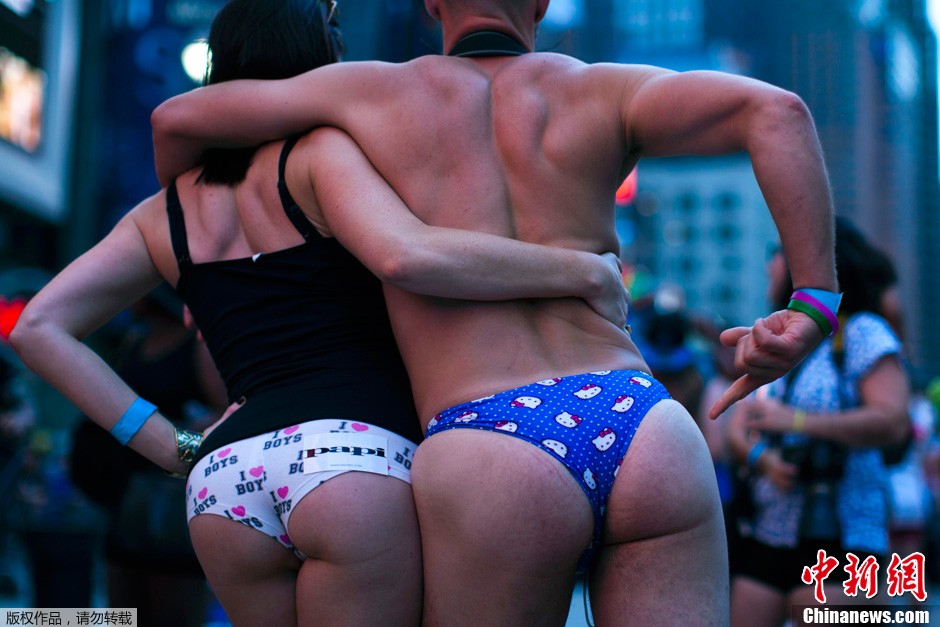 当地时间2013年8月5日,美国纽约,众多民众身着内衣聚集时报广场,试图打破身着内衣聚集人数最多的吉尼斯世界纪录。目前的纪录为2270人。