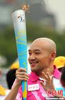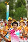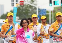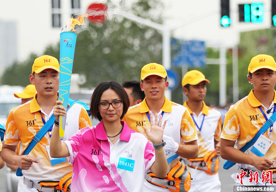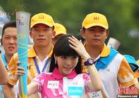 8月6日上午,继8月2日在南京玄武湖、明城墙传递后,第二届亚洲青年运动会第二次实体火炬传递在南京河西新城举行,134棒、500多位火炬手参与了这条全长6.7公里的“青春活力人文线”传递,其中有特殊学生代表、各界知名人士、媒体代表和周笔畅、吴莫愁等演艺明星以及吴静钰等体育明星。亚青会将于8月16日至8月24日在南京举办。图为周笔畅低调传火炬。泱波 摄