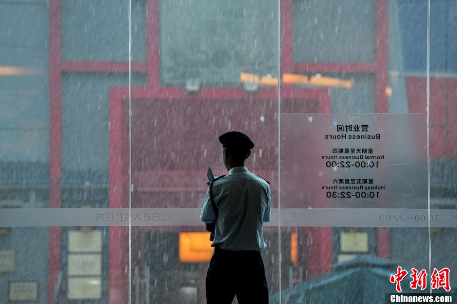 8月7日下午2时30分左右,广西南宁受热带风暴“山竹”外围云系影响,降下短时强降雨,路上行走的市民突然“遭袭”,纷纷躲避。据了解,今年第10号热带风暴“山竹”8月7日下午3时位于北纬18.9°、东经107.1°,最大风速23米/秒。图为一名商场保安向室外观望。洪坚鹏 摄