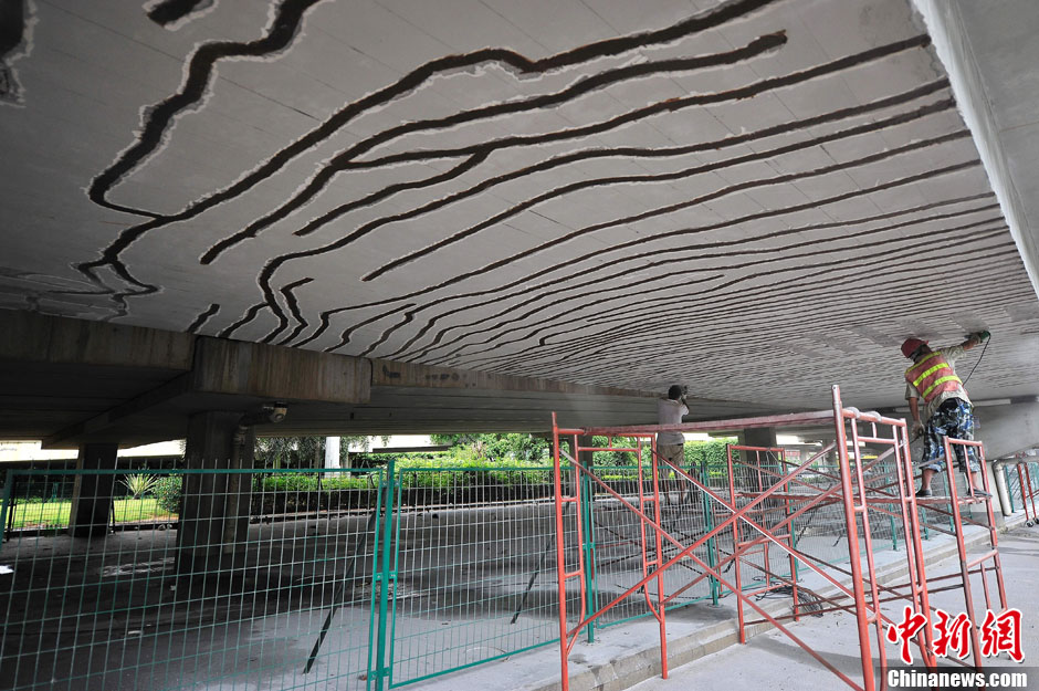 8月7日,海口市南大桥国兴大道引桥桥体出现密密麻麻的裂缝犹如穿上了“豹纹装”,在现场,工人正在对桥体裂缝进行修补。据了解,桥体目前已出现200多条裂缝,有的裂缝宽度达到0.25毫米,还有裂缝长度贯穿整个桥梁(100多米),大桥的出口处还出现凹陷路面。海口市桥梁管理有限公司负责人回应称不影响通车安全。中新社发 骆云飞 摄