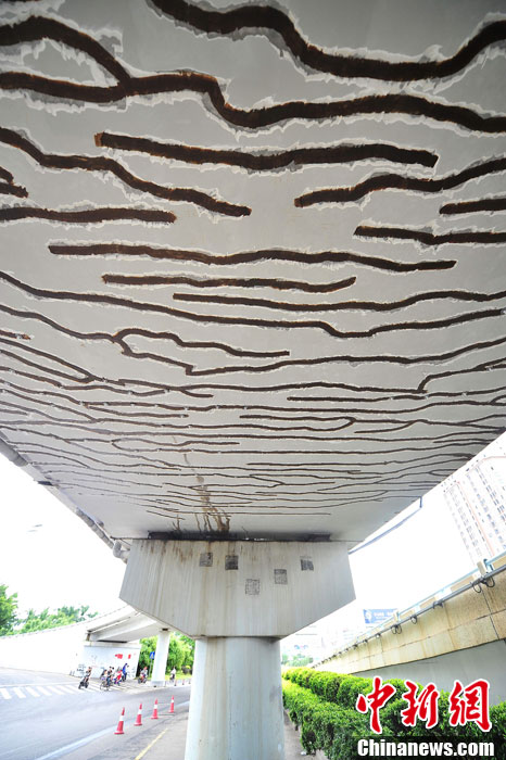 8月7日,海口市南大桥国兴大道引桥桥体出现密密麻麻的裂缝犹如穿上了“豹纹装”,在现场,工人正在对桥体裂缝进行修补。据了解,桥体目前已出现200多条裂缝,有的裂缝宽度达到0.25毫米,还有裂缝长度贯穿整个桥梁(100多米),大桥的出口处还出现凹陷路面。海口市桥梁管理有限公司负责人回应称不影响通车安全。中新社发 骆云飞 摄