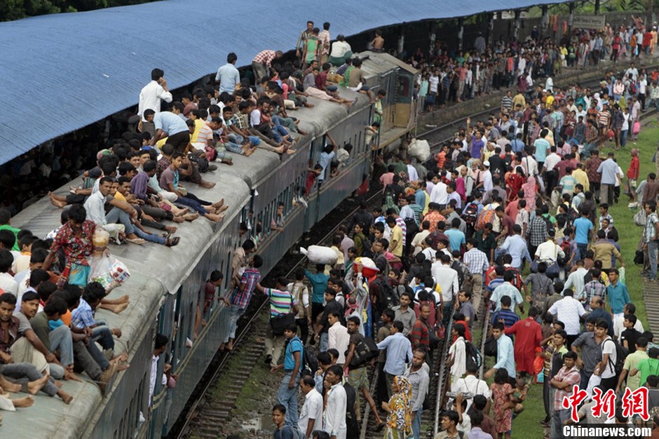 当地时间2013年8月7日,孟加拉国达卡,穆斯林挤火车回家过开斋节。图片来源:东方IC 版权作品 请勿转载