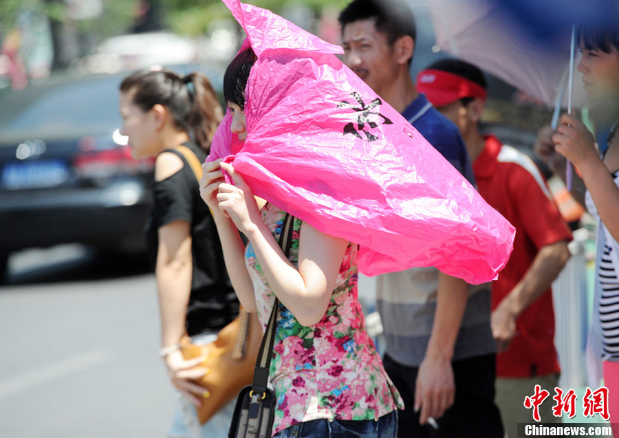 8月6日下午14时,杭州最高气温达到41.5℃,创下了历史纪录。路人临时将塑料袋当遮阳工具。图片来源:东方IC 版权作品 请勿转载