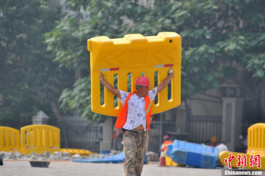 8月7日,青岛,酷暑下工作工人的特殊遮阳板。图片来源:东方IC 版权作品 请勿转载