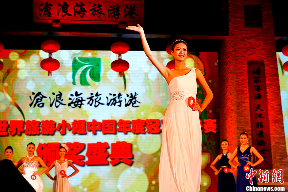2013世界旅游小姐中国年度冠军总决赛8月8日晚在湖北丹江口市沧浪海旅游港举行,来自全国21个分赛区的63名佳丽,经过复赛,最终39名旅游形象大使脱颖而出,角逐全国年度总冠军。当晚,佳丽们通过泳装、晚礼服及一系列才艺展示,最终17岁的四川选手丁琬苧摘得挂冠,19岁的网络赛区选手刘梦夺得亚军、24岁的江苏赛区选手李晨晨获得季军。图为冠军丁琬苧展示风采。中新社发 赵隽 摄
