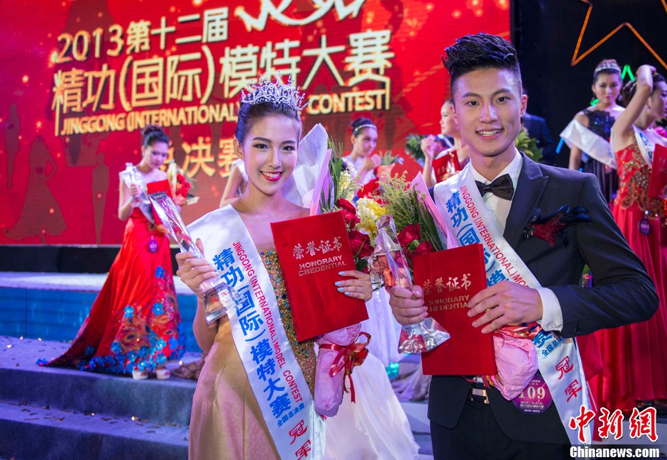 8月10日晚,2013第十二届精功(国际)模特大赛全国总决赛在海南海口举行,来自全国18大选区7大赛区的48位总决赛入围选手经过休闲装、泳装、晚装等环节的激烈角逐,最终014号选手魏舒羽(女)、103号选手王炳棋分获男女冠军;002号选手蒋瑞琪(女)、111号选手刘延路分获男女亚军;018号选手李若男(女)、112号选手林放摘得男女季军。图为获得男女冠军的014号选手魏舒羽(女)和103号选手王炳棋。中新社发 骆云飞 摄
