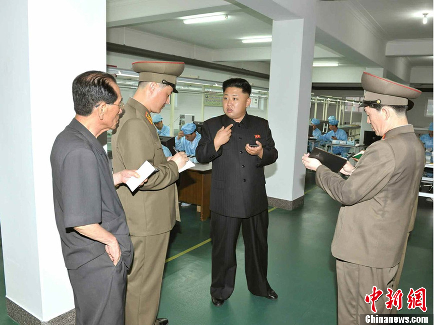据朝鲜媒体当地时间2013年8月11日报道,朝鲜最高领导人金正恩对生产手机等电子产品的“5月11日工厂”进行了视察。报道说,金正恩参观了工厂组装中心等地,并重点检查了该工厂生产的“阿里郎”手机的性能和包装。图片来源:东方IC 版权作品 请勿转载