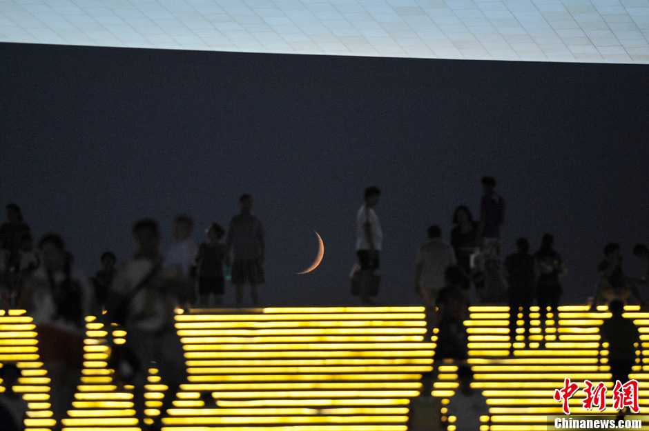 8月10日晚,在山西太原长风商务区,民众在一轮弯月下乘凉。立秋以来,中国多地高温不退,许多民众选择夜间去户外消暑。中新社发 韦亮 摄