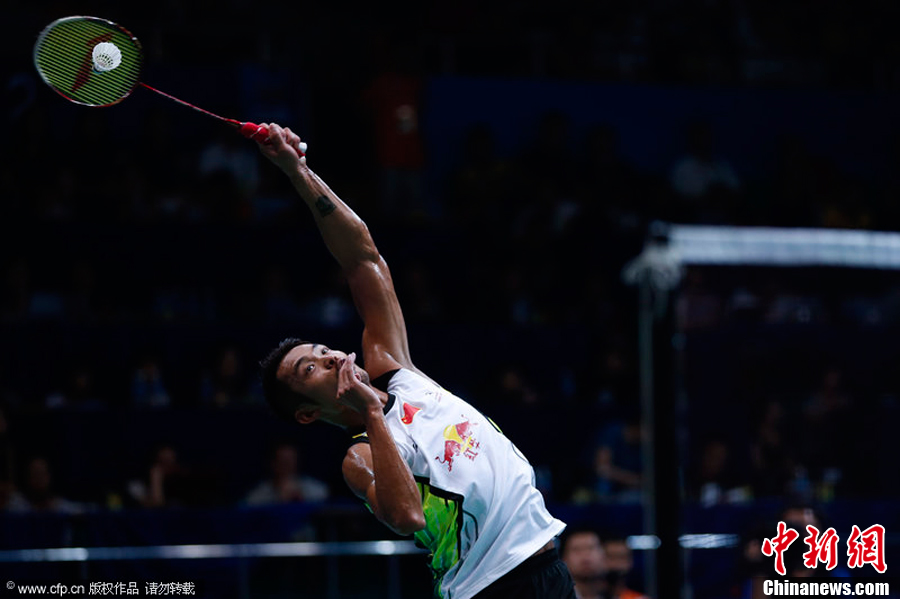 8月11日,羽球世锦赛男单决赛林丹2-1击败李宗伟,获得个人第五个世锦赛男单冠军,李宗伟最后时刻伤退。图为林丹在比赛中。王志杰 摄 图片来源:CFP视觉中国