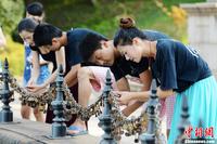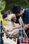8月12日,正值中国七夕情人节前夕,长沙世界之窗内的爱情石、同心锁、鹊桥等吸引了众多情侣前来。据主办方介绍,游客将刻的石头镶嵌在情山上,将同心锁挂在喷泉旁,从而祈愿自己的爱情能够天长地久。图为情侣们在喷泉旁挂起同心锁。杨华峰 摄