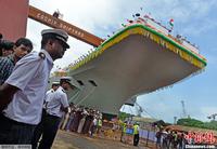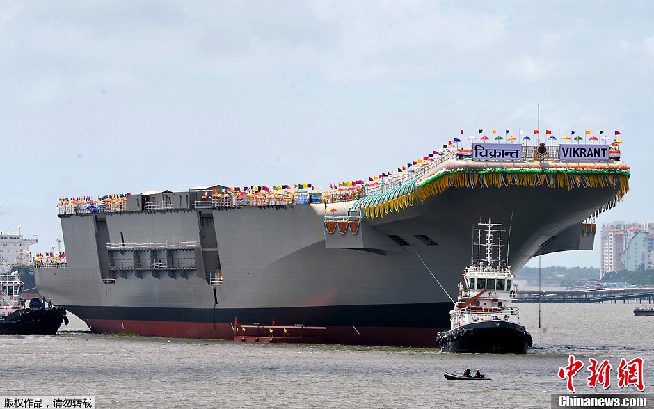当地时间8月12日,印度首艘国产航母“维克兰特”号在印度科钦船厂正式下水。印度国防部长安东尼(A.K. Antony)出席航母下水仪式并讲话。这艘航母下水时实际上只完工了30%,下水后还要进行舾装,包括动力安装、电缆铺设,以及武器系统安装,另外还有维修车间设施和雷达通讯设施的安装。据悉,此艘航母全长260米,宽60米,排水量为4万吨,最大航速28节,续航力达8000海里。