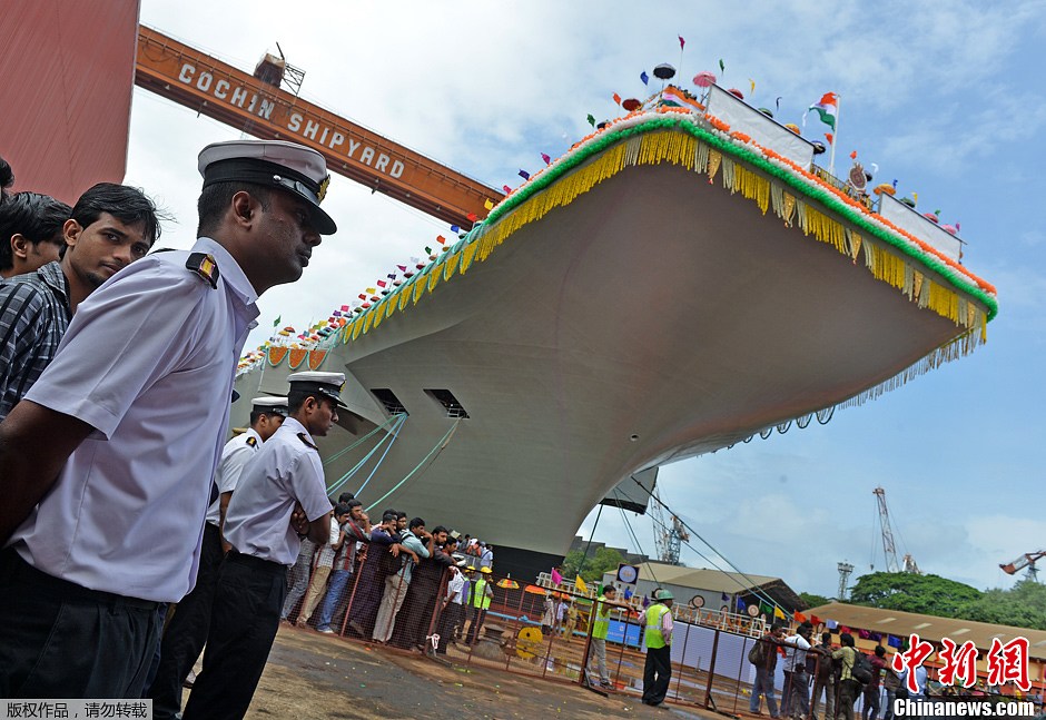 当地时间8月12日,印度首艘国产航母“维克兰特”号在印度科钦船厂正式下水。印度国防部长安东尼(A.K. Antony)出席航母下水仪式并讲话。这艘航母下水时实际上只完工了30%,下水后还要进行舾装,包括动力安装、电缆铺设,以及武器系统安装,另外还有维修车间设施和雷达通讯设施的安装。据悉,此艘航母全长260米,宽60米,排水量为4万吨,最大航速28节,续航力达8000海里。
