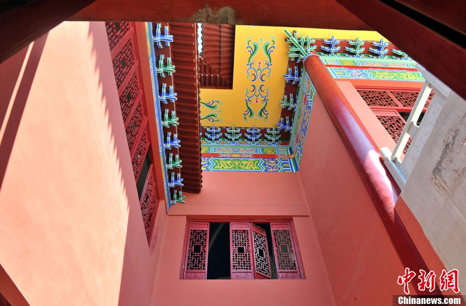 图为正在修建的墓地的雕梁画栋、红砖绿瓦建筑。中新社发 张畅 摄