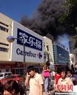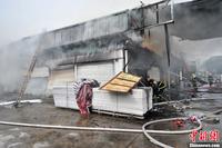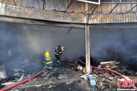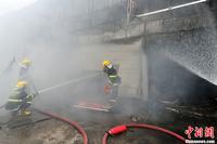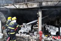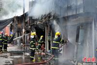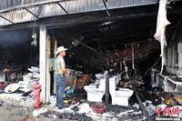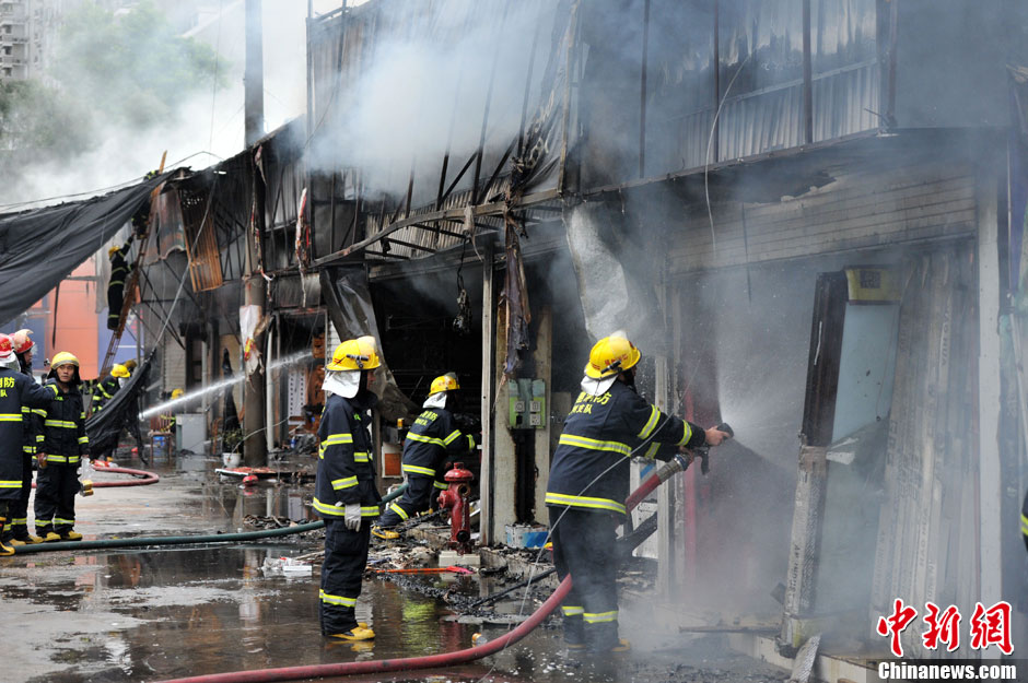8月13日上午,福州市工业路边的黎明建材市场发生火灾。10多辆消防车赶抵现场,经过武警消防官兵的奋力扑救,火势已得到控制。据了解,火灾造成了20多家店面被烧毁,过火面积约900平方米,未造成人员伤亡,火灾原因正在调查中。图为消防人员在火灾现场灭火。吕明 摄