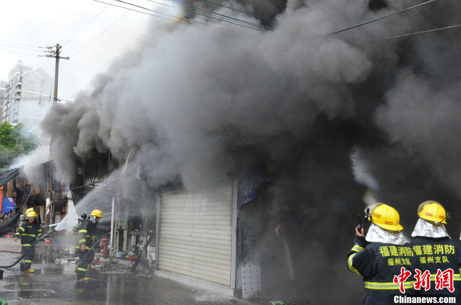 8月13日上午,福州市工业路边的黎明建材市场发生火灾。10多辆消防车赶抵现场,经过武警消防官兵的奋力扑救,火势已得到控制。据了解,火灾造成了20多家店面被烧毁,过火面积约900平方米,未造成人员伤亡,火灾原因正在调查中。图为消防人员在火灾现场灭火。中新社发 郑祚声 摄
