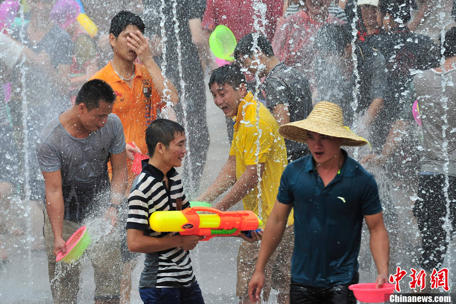 8月13日,农历“七夕”,2013年中国(海南)七仙温泉嬉水节在海南省保亭黎族苗族自治县七仙广场举行,上万当地民众和游客聚集在此,泼水嬉戏、共同祈福。中新社发 骆云飞 摄