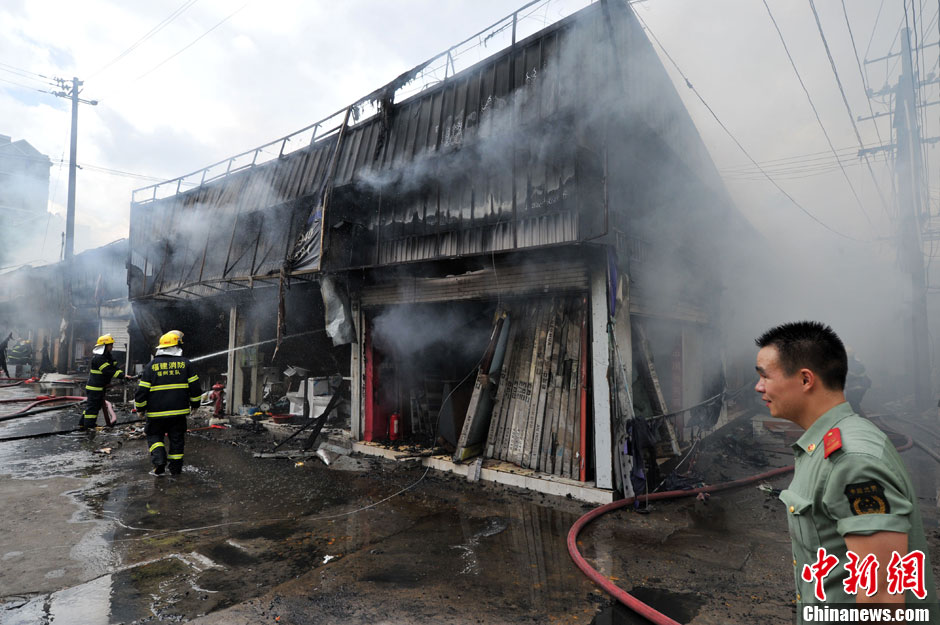 8月13日上午,福州市工业路边的黎明建材市场发生火灾。10多辆消防车赶抵现场,经过武警消防官兵的奋力扑救,火势已得到控制。据了解,火灾造成了20多家店面被烧毁,过火面积约900平方米,未造成人员伤亡,火灾原因正在调查中。图为消防人员在火灾现场灭火。吕明 摄