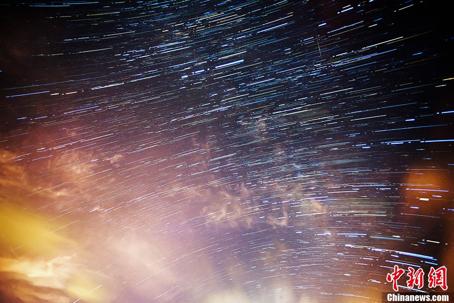 8月12日晚至13日凌晨,海南三亚,英仙座流星雨如约而至出现在该地上空。图为流星在合成的星轨当中十分抢眼。罗弘扬 摄