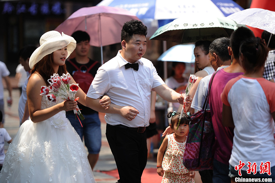 8月13日,重庆一对“新人”穿着婚纱在步行街上送玫瑰花。七夕节来临,重庆一商场为吸引更多顾客光顾,派出了两名年轻员工穿着婚纱和西装,在步行街上为市民发放玫瑰花,引导顾客进店。图为商场员工扮“新人”街头送玫瑰。陈超 摄