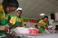 图为猪肉上已经沾满了沥青,只要在开水锅中一煮,沥青就会卷带着猪毛一起脱落。