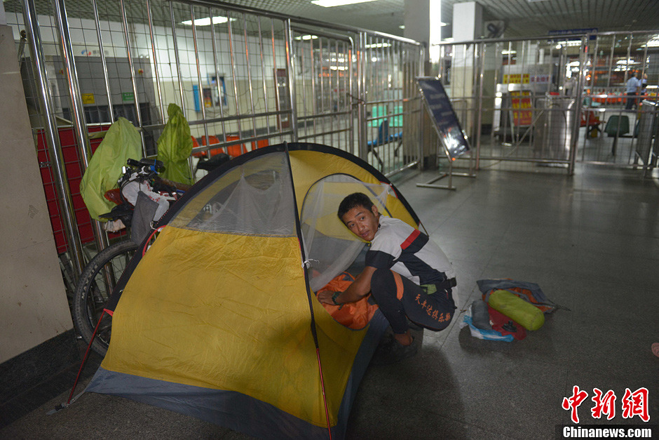 8月13日,海口秀英港侯船大厅内,一位自行车爱好者支起帐篷准备在此过夜。受强台风“尤特”影响,海南琼州海峡已于13日7时全线停航,海南东环高铁动车组自8月13日15时30分起全线停运。中新社发 骆云飞 摄