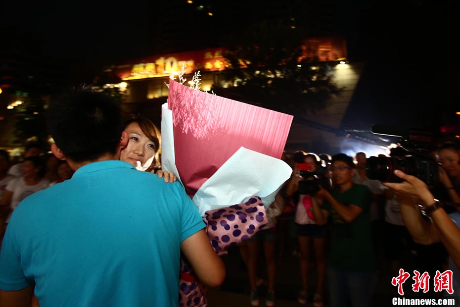 8月13日晚,一名青年借七夕节在太原某商业街头向“突袭”女友求婚。七夕节是中国的传统节日,又因为牛郎织女的传说,被誉为中国的情人节。张云 摄