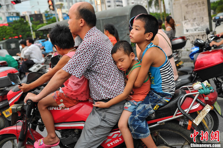 8月13日下午,预计将受强台风“尤特”正面严重影响的广西北海,“享受”狂风暴雨来临前的宁静。图为北海街头,一个孩子在摩托车上睡着。中新社发 洪坚鹏 摄