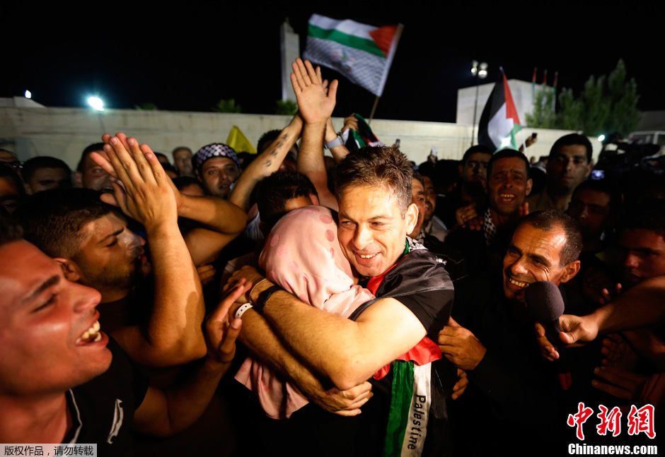 当地时间2013年8月13日晚,以色列释放首批26名巴勒斯坦在押人员。其中15名巴方囚犯于13日凌晨1点40分抵达加沙地带,另外11名在差不多时间抵达约旦河西岸的拉姆安拉。他们都受到了巴方的热烈欢迎。