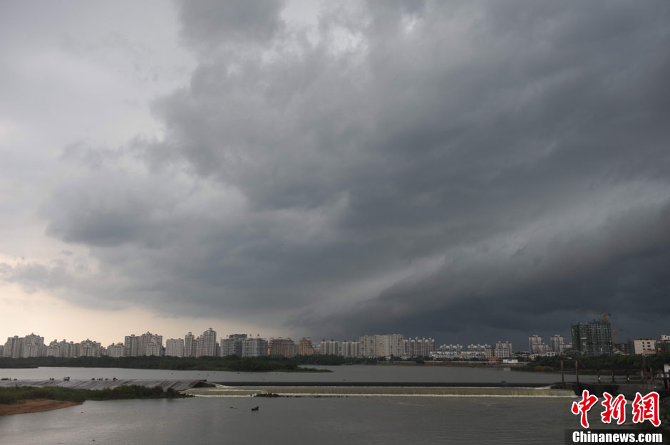 今年第11号强台风“尤特”目前正在逐渐向琼粤一带沿海逼近,中心附近最大风力14级。受其影响,8月13日下午,海南琼海市乌云密布暴雨倾盆。图为万泉河上空乌云密布。中新社发 蒙钟德 摄 图片来源:CNSPHOTO