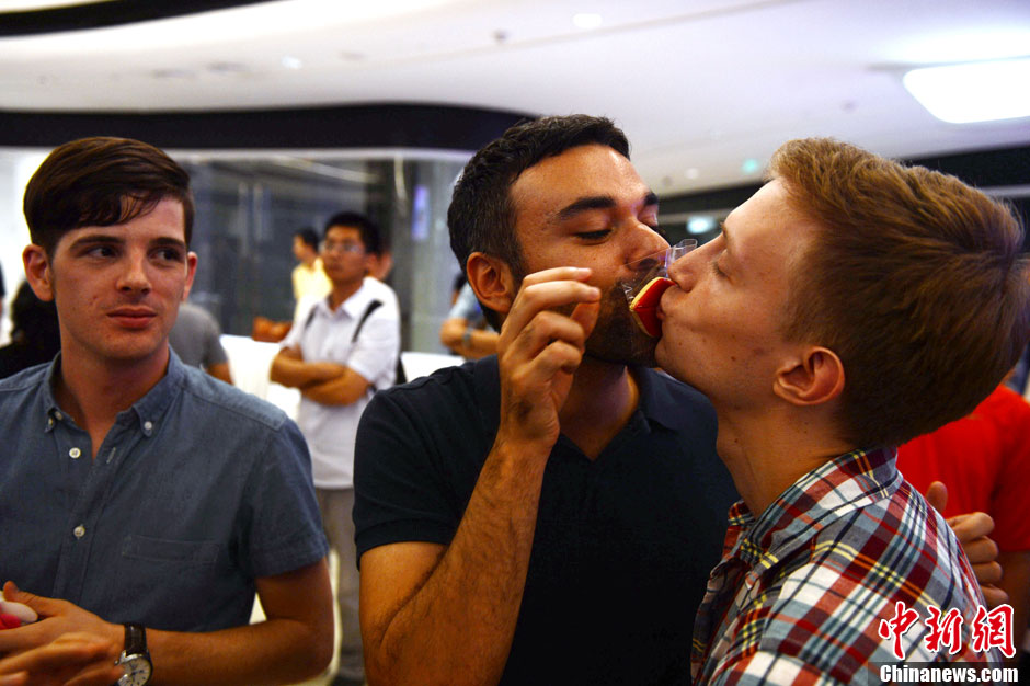 8月13日晚,“813不要散,狠狠爱”活动在北京举行。当晚是七夕夜,众多情侣前来挑战“接吻大赛”,不惧各种高难度接吻动作大秀恩爱。图为洋帅哥接吻抢镜。中新社发 李学仕 摄