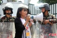 8月14日,菲律宾民间团体“全国民主运动”(KPD)发动民众在菲国防部驻地阿吉纳尔多兵营大门外集会抗议,反对美军扩大在菲“轮换”驻扎。
