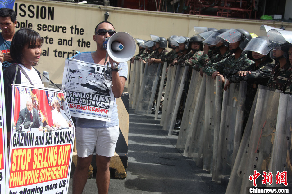 8月14日,菲律宾民间团体“全国民主运动”(KPD)发动民众在菲国防部驻地阿吉纳尔多兵营大门外集会抗议,反对美军扩大在菲“轮换”驻扎。中新社发 张明 摄