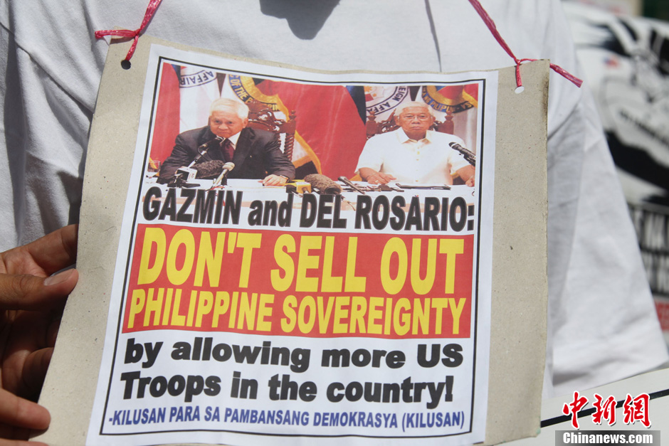 8月14日,菲律宾民间团体“全国民主运动”(KPD)发动民众在菲国防部驻地阿吉纳尔多兵营大门外集会抗议,反对美军扩大在菲“轮换”驻扎。中新社发 张明 摄