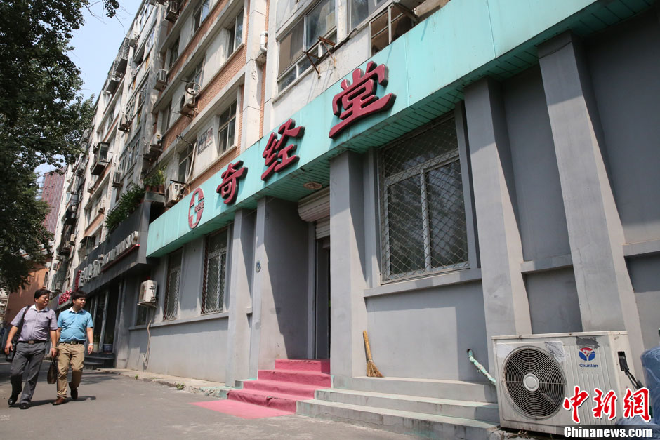 8月14日,位于北京呼家楼南里的奇经堂开门营业,店内工作人员称之前关闭营业是因为受张必清人济山庄楼顶加盖“超级别墅”事件的影响,店内生意冷清以至无人前来就诊看病,因而店面提前关闭。中新社发 熊然 摄