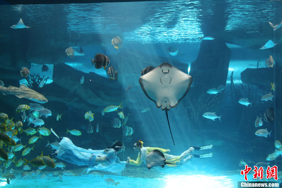 8月13日,山东泉城海洋极地世界海洋馆上演了浪漫的水下“七夕节”表演。扮演“牛郎”和“织女”的水下演员在梦幻般的水幕中相遇起舞,水中可爱的鳐鱼做出360度翻转,温柔的豹纹鲨拖着长尾摇曳,绚丽的黄金鲹环绕四周。姜山 摄