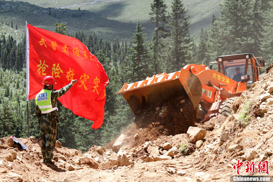 西藏昌都地区8月12日发生6.1级地震后,武警交通二支队全力投入抗震救灾。经过连续奋战,累计疏通灾区“生命线”100余公里,并已在通往受灾最为严重的米扎村方向打通17公里道路。截至14日上午,该支队已转移安置群众500余人。图为武警交通二支队抢通救援道路。中新社发 汪巍 摄
