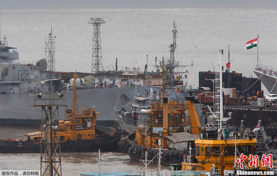据媒体报道,一艘载有18名艇员的印度潜艇8月14日在孟买基地爆炸起火后沉没。另据印度斯坦时报8月14日报道,印度2012年完成技术升级的基洛级潜艇“辛杜拉克沙克”号周三凌晨3时许在孟买船厂爆炸起火,目前造成18人失踪。图为火灾过后的基地。