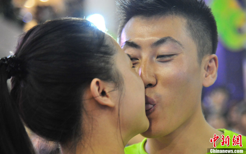 8月13日晚,情侣参加“接吻大战”。七夕之夜沈阳上演“接吻大战”,近千名市民现场观看。中新社发 于海洋 摄