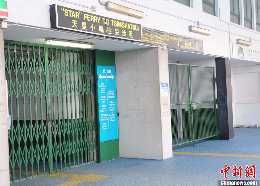 14日凌晨香港天文台挂出八号风球(八号东南烈风或暴风信号)。下午13时许,湾仔天星小轮码头依然落闸谢客。中新社发 赵建华 摄