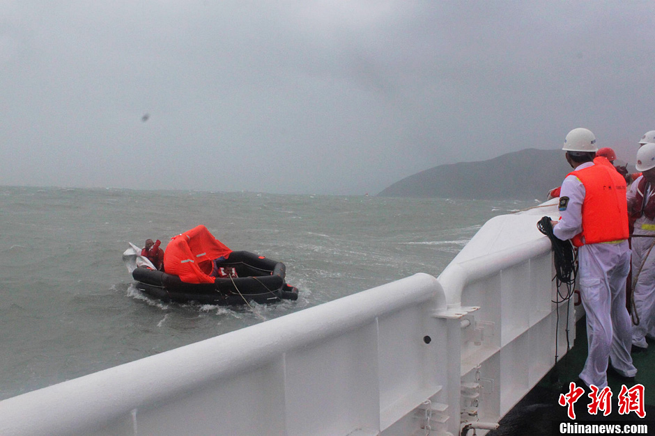 8月14日,今年最强台风“尤特”袭击广东沿海,在附近洋面掀起10级以上大风及6米以上大浪。受其影响,一艘香港籍矿砂船在珠江口附近海域倾覆,21名船员弃船逃生。经中国交通运输部南海救助局专业救助船“南海救116”轮与香港政府飞行服务队联合搜救,落水人员已全部安全救起。图为救援人员将两名落水者救上船。中新社发 康乐 摄