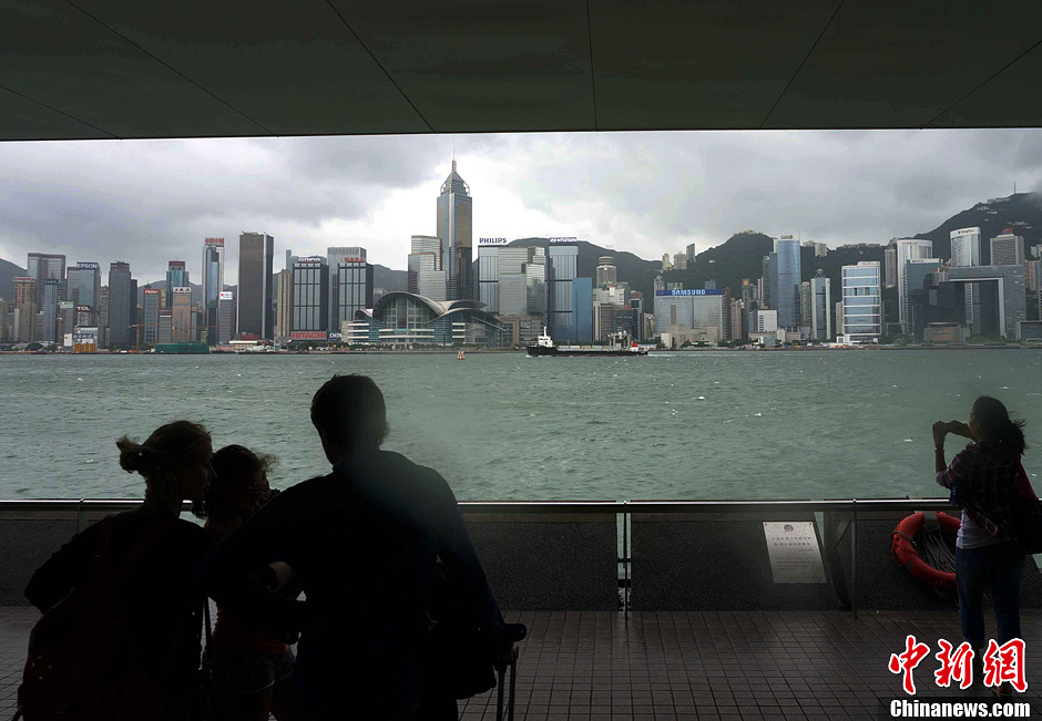 8月14日中午,香港在8号强台风信号下,市面平静,有游客改到海边观浪,港岛犹如卷轴画。14日凌晨,香港悬挂八号强台风信号12小时后改为3号强风信号。中新社发 洪少葵 摄