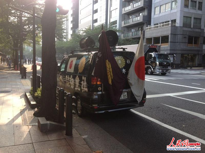 图为靖国神社外的日本右翼团体车辆。赵松 摄 图片来源:人民网