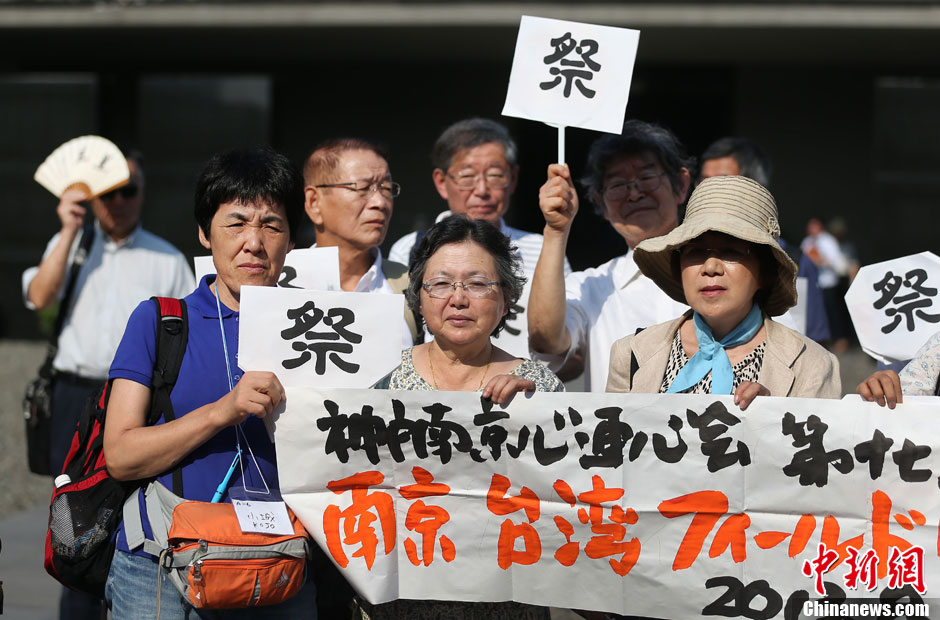 8月15日,来自日本神户·南京心连心友好访华团的成员在悼念侵华日军南京大屠杀遇难者。中新社发 泱波 摄