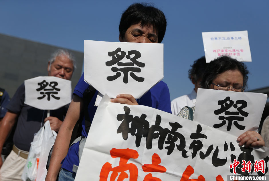 8月15日,来自日本神户·南京心连心友好访华团、日本铭心会·南京友好访华团、长崎日中友好希望之翼访华团的成员在悼念侵华日军南京大屠杀遇难者。中新社发 泱波 摄