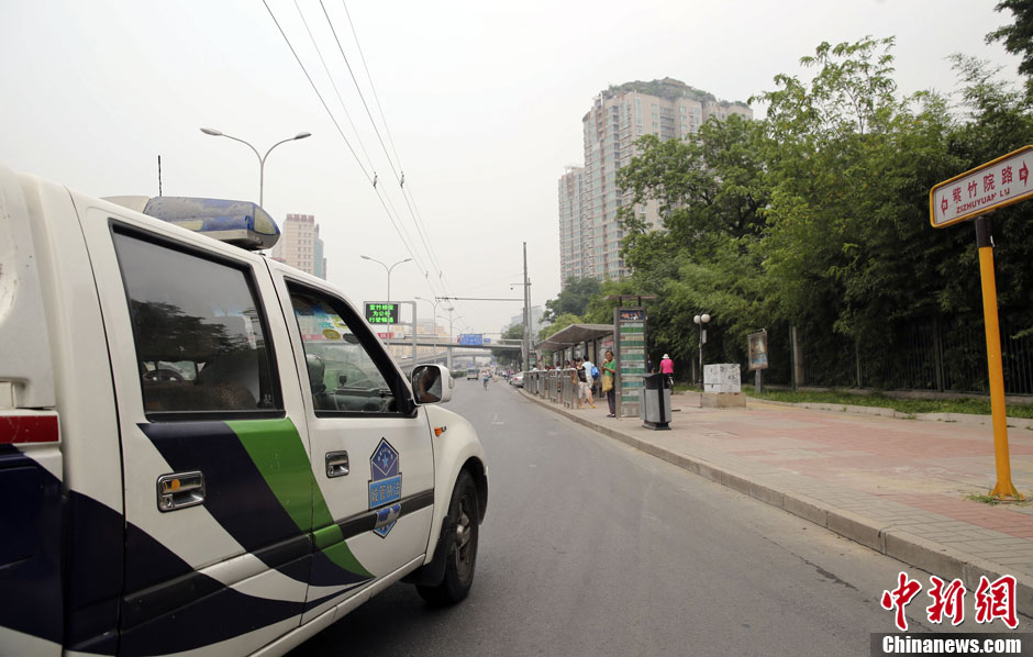 8月15日,北京人济山庄楼顶别墅开始拆除,三名工人在楼顶对假山和违建进行拆卸。图为城管现场监督。中新社发 韩海丹 摄
