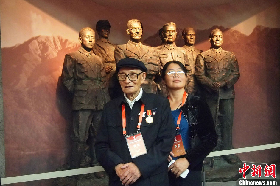 8月15日,滇西抗战纪念馆在腾冲正式开馆。图为一名抗战老兵和子女在雕塑前拍照留念。中新社发 胡远航 摄
