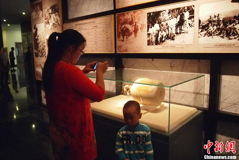 8月15日,滇西抗战纪念馆在腾冲正式开馆。位于纪念馆西侧的中国远征军名录墙是纪念馆的一大亮点,墙上镌刻103141位远征军将士的姓名。图为市民拍摄日军在滇西使用化学武器的证据细菌弹。中新社发 胡远航 摄