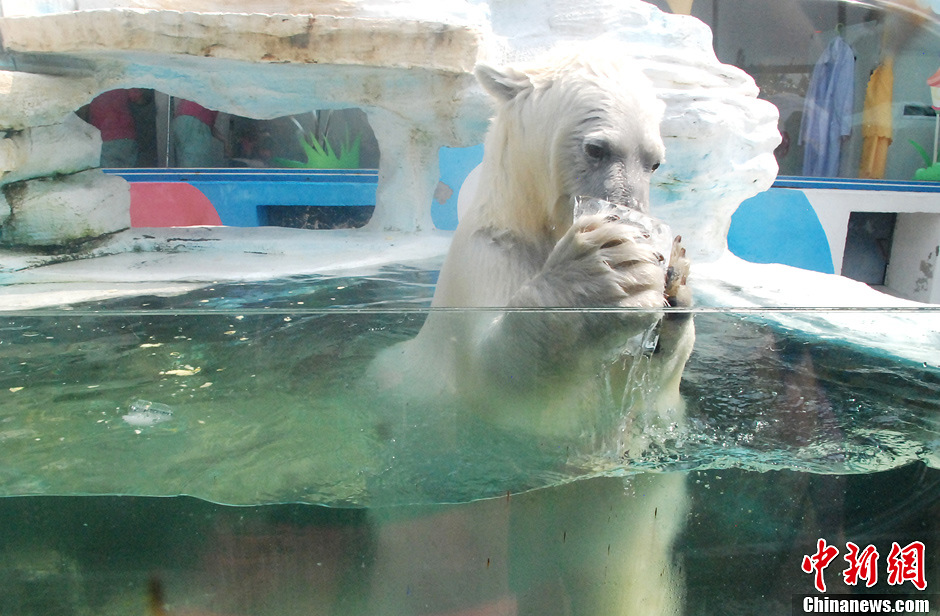 8月15日,大连动物园里北极熊“梦想”游泳池内玩耍消暑。中新社发 李响 摄