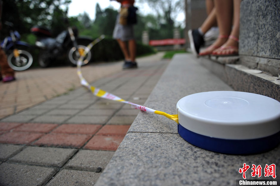 8月15日,备受社会关注的北京“楼顶别墅”今天上午开始拆除。当日下午,物业公司工作人员在楼下拉起警戒线,防止高空坠物。中新网记者 金硕 摄